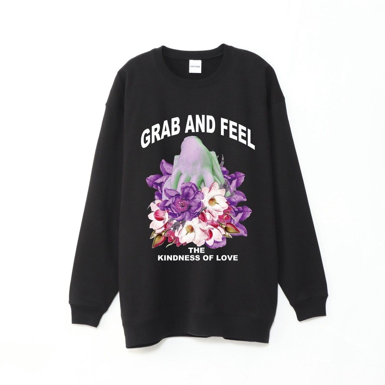 フロントに描かれたのは、柔らかくも力強く花々を包み込む手。アーチ状の「GRAB AND FEEL」と、下部の「THE KINDNESS OF LOVE」が、愛の優しさと確かさを同時に語ります。